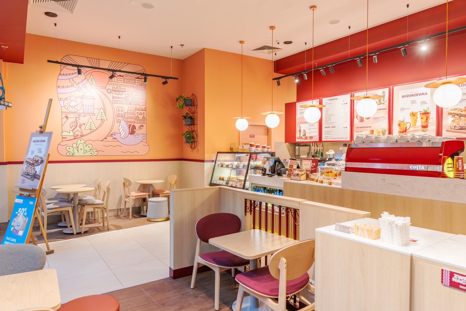 W menu Costa Coffee znajdują się klasyczne kawy, napoje sezonowe, herbaty, desery, a także kanapki i przekąski. Kawiarnia wyróżnia się przyjazną atmosferą i troską o każdy detal – od starannego parzenia po sposób podania. Costa Coffee to przestrzeń, w której kawa staje się przyjemnością, a codzienność nabiera wyjątkowego smaku.