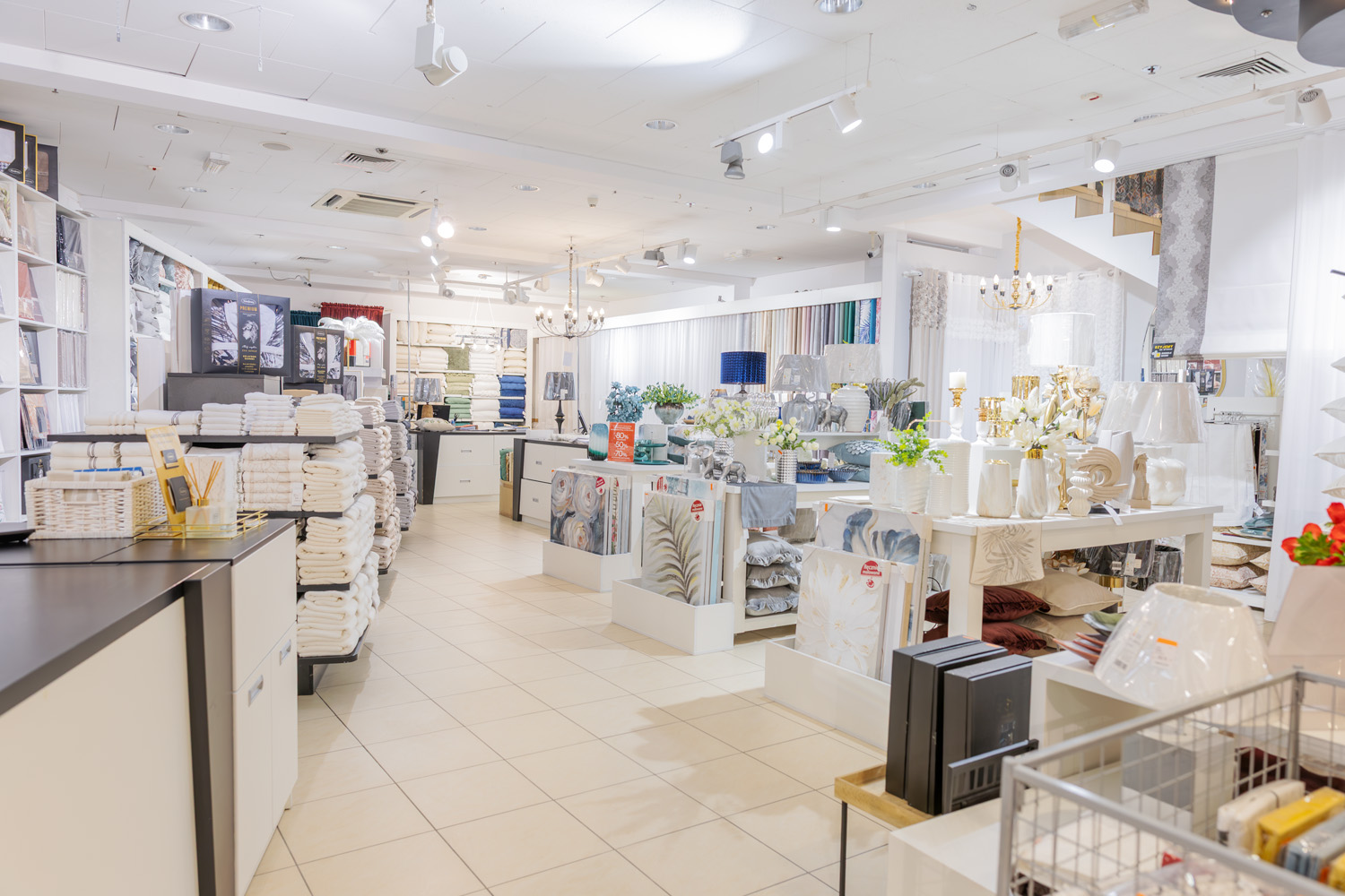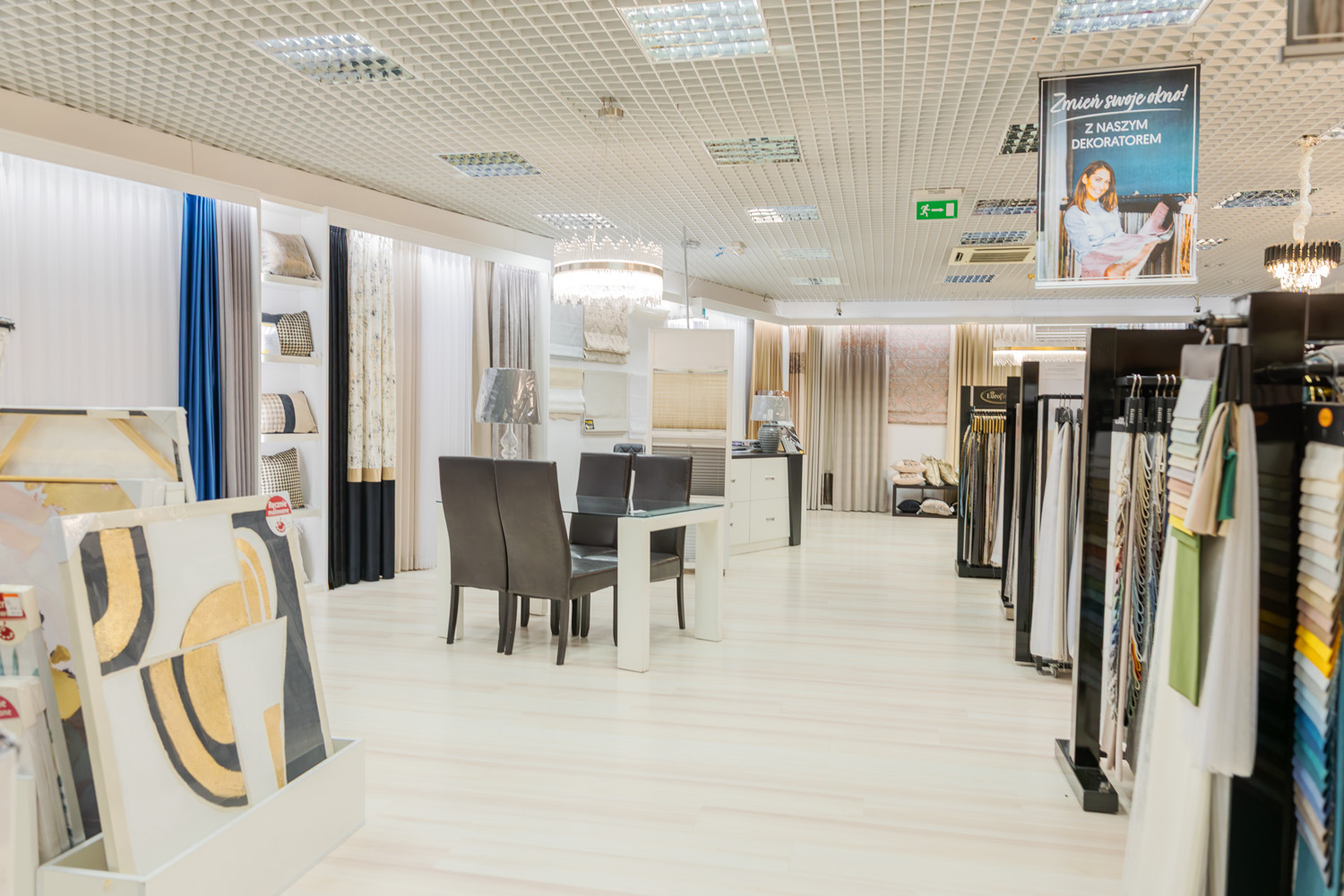 W salonie dostępny jest bogaty asortyment: tkaniny na firanki i zasłony, rolety rzymskie oraz różnorodne tekstylia domowe (narzuty, pościel, koce, ręczniki). Oferta obejmuje także dodatki, takie jak ceramika, lampy, obrazy, kwiaty oraz dekoracje świąteczne. Marka zapewnia również kompleksową usługę dekoracji okien, obejmującą wszystkie etapy: od pomiaru przez szycie aż po profesjonalny montaż.