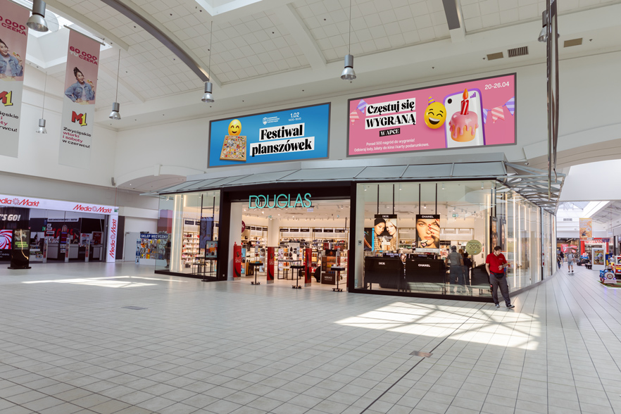 Duży baner nad wejściem do MediaMarkt, a w pobliżu HalfPrice i Douglas o wymiarach 12x4m oraz łącznej powierzchni 48m2.